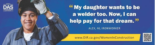 The campaign messaging was developed based on feedback from apprentices, journeywomen, construction employers, and DIR’s Women in Construction Committee. It focuses on real-world experiences in the trades, highlighting mentorships, skill development, and the confidence gained through apprenticeships, while also emphasizing the strong industry partnerships that support women entering and advancing in construction.