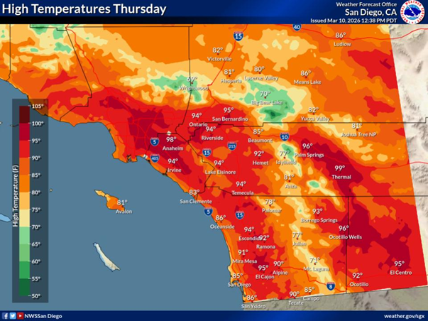 A heat advisory has been issued in Southern California for tomorrow and Friday by the National Weather Service. Temperatures are expected to increase across the Los Angeles, Orange, San Bernardino, Riverside and San Diego Counties. Inland areas are expected to reach the 90s, while coastal areas are forecast in the mid-80s.