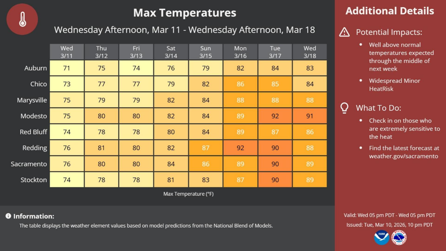 Areas of Northern California are also expected to hit high temperatures through next Wednesday.