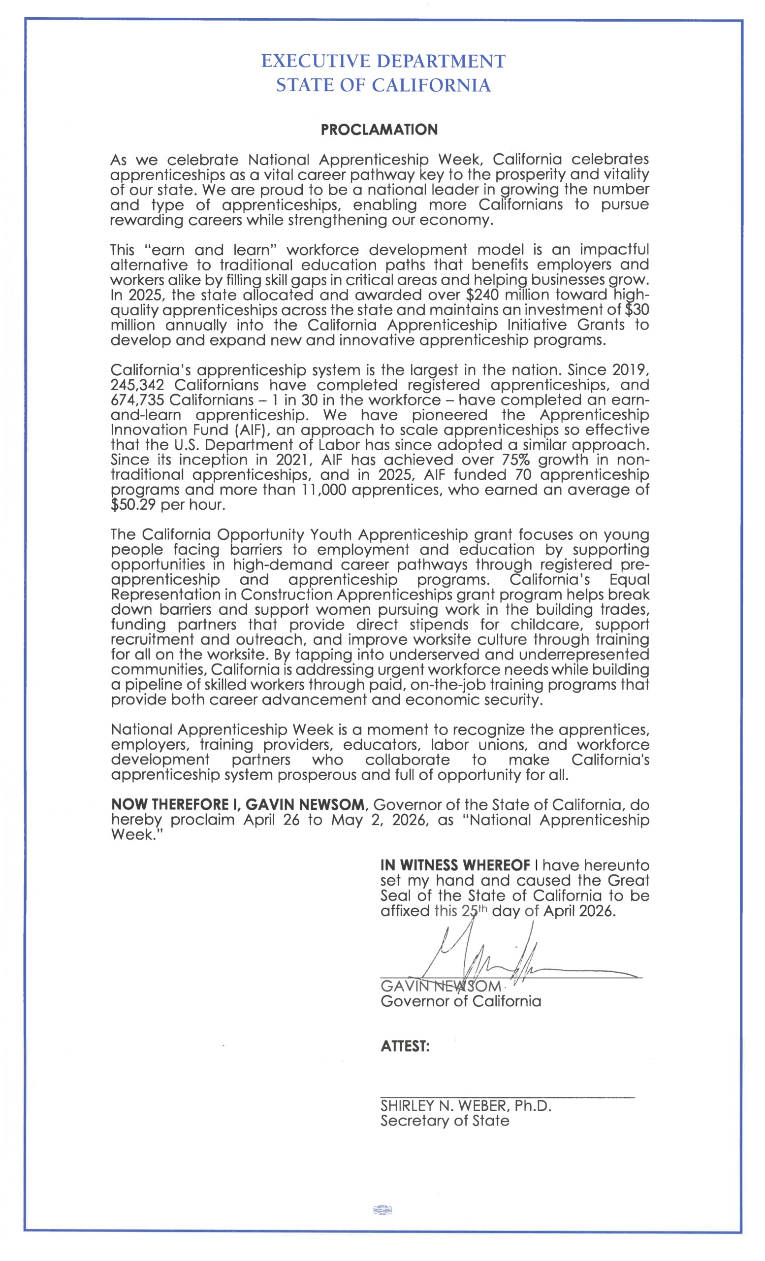 In celebration of National Apprenticeship Week, Governor Gavin Newsom issued the following proclamation: