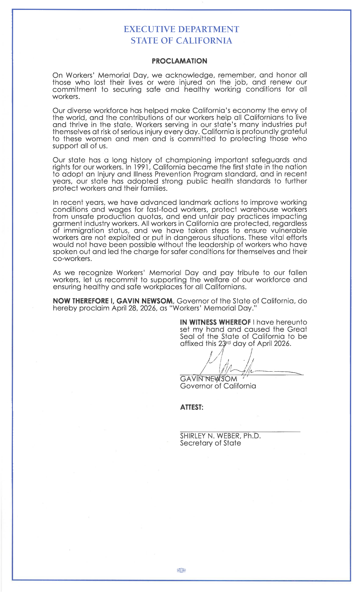 Governor Gavin Newsom released the following proclamation in honor of Workers’ Memorial Day.