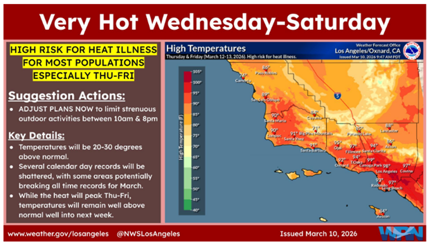 A heat advisory has been issued in Southern California for tomorrow and Friday by the National Weather Service. Temperatures are expected to increase across the Los Angeles, Orange, San Bernardino, Riverside and San Diego Counties. Inland areas are expected to reach the 90s, while coastal areas are forecast in the mid-80s.